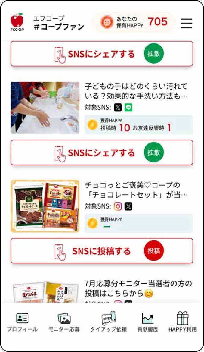新規登録、SNS連携、ログイン、投稿、シェア、モニター参加でポイントが貯まります。